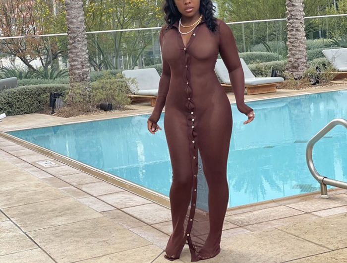 2021 Styles Women Fashion INS Styles Fashion Mesh Long Sleeve Maxi DressSKU: #CF48274-4