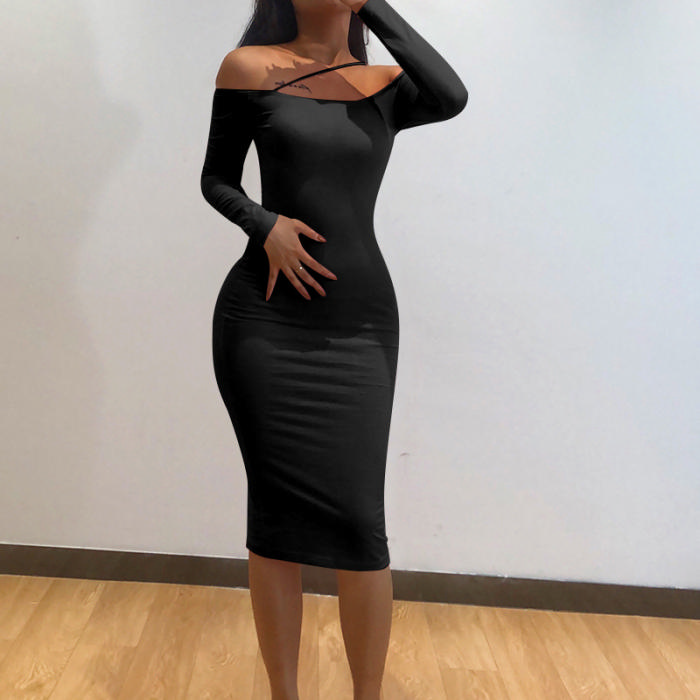 2022 Styles Women Fashion INS Styles Off Shoulder Solid Color Long Sleeve Midi DressSKU: #XF92529-2