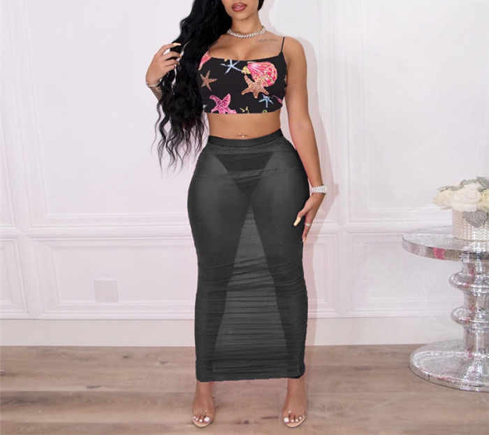 2022 Styles Women Fashion INS Styles Pink Print Strap Tank Tops+Maxi Skirts Maxi DressSKU: #CF49861-2