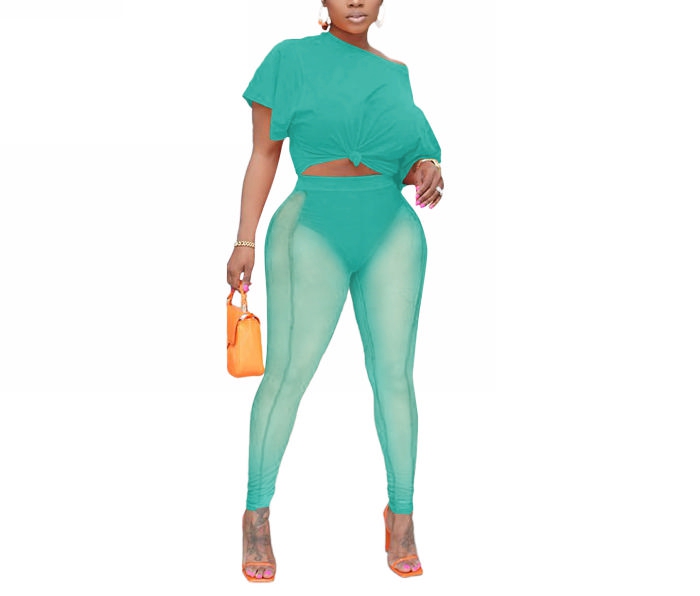 2022 Styles Women Fashion INS Styles Solid Color Short Sleeve Tee+Mesh Long Pants Two Piece SuitSKU: #OM0213-9