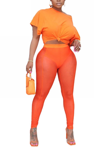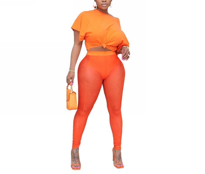 2022 Styles Women Fashion INS Styles Solid Color Short Sleeve Tee+Mesh Long Pants Two Piece SuitSKU: #OM0213-8
