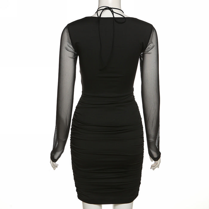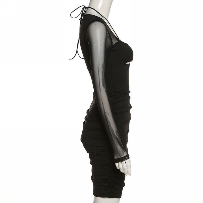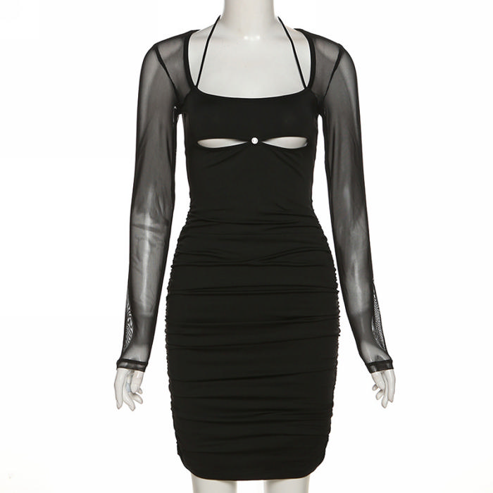 2022 Styles Women Fashion Spring INS Styles Mesh Long Sleeve Cut Out Mini DressSKU: #OEM5525-1