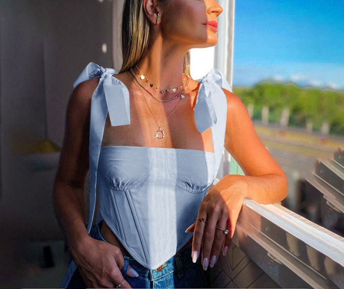2022 Styles Women Fashion Spring Sleeveless Camisole Tie Shoulder Mesh Strap Tank Crop TopsSKU: #OEM5542-3