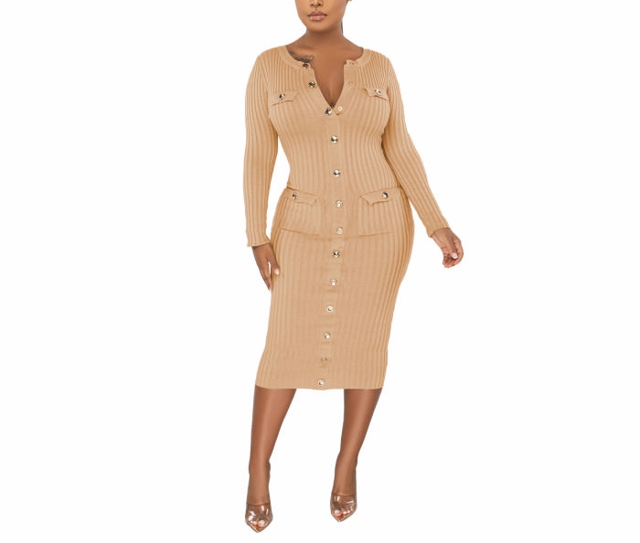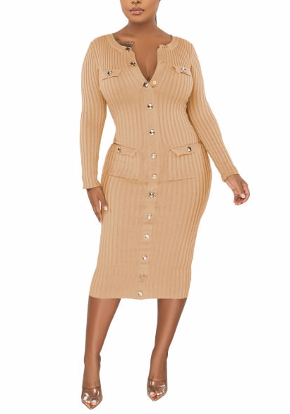 (Apricot)2022 Styles Women Fashion Spring&Winter TikTok&Instagram Styles Long Sleeve Front Button Midi DressSKU: #XF82067-2