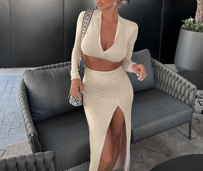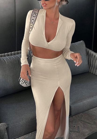 (Apricot)2022 Styles Women Fashion Summer TikTok&Instagram Styles Long Sleeve Crop Tops + Maxi Skirts Two Piece DressSKU: #XF92637-2