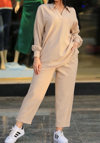 (Apricot)2024 Styles Plus Size Women Spring Collar Long Sleeve Shirt with High-Waist Pocket Casual Pants SetSKU: #CF91067-2