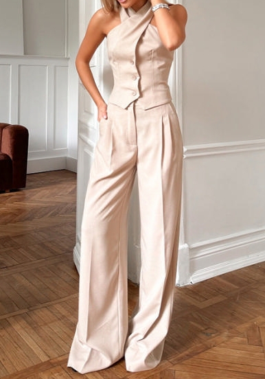 (Apricot)2024 Styles Women Casual Halter Top with Wide-Leg Pants Suit SetSKU: #XF92930-2