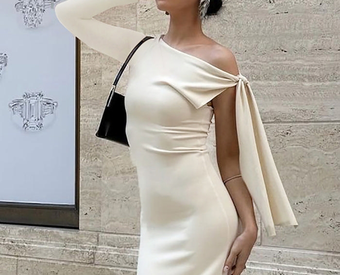 (Apricot)2024 Styles Women One-Shoulder Asymmetrical Neckline Tied-Waist Solid Color Bodycon DressSKU: #CF88279-3