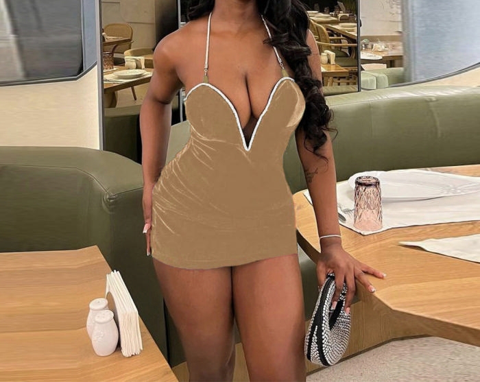 (Apricot)2024 Styles Women Summer Color-Blocked Open Back Deep V Euro Halter DressSKU: #CF59878-2