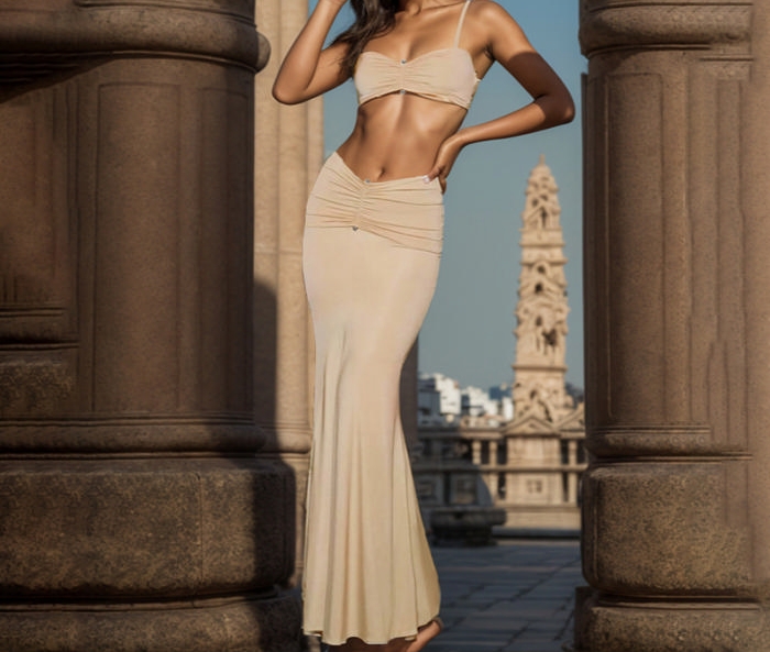 (Apricot)2024 Styles Women Summer Fashion Sexy Open Back Halter Pleated Slimming Maxi Dress SetSKU: #CF83331-3