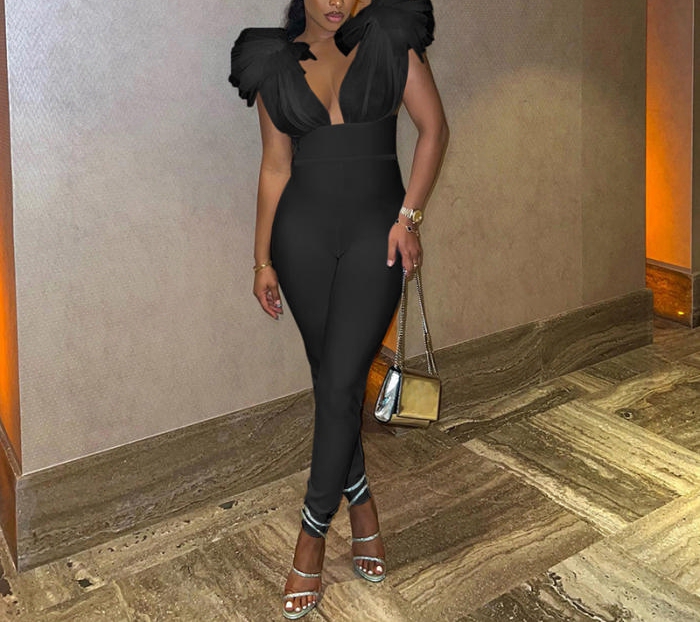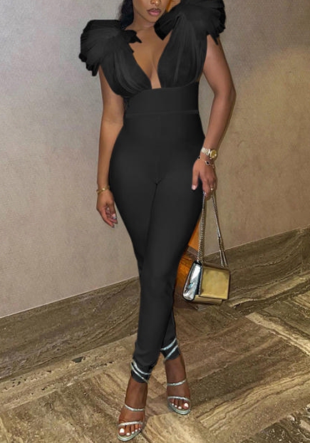 (Black)2022 Styles Women Fashion Instagram Styles Solid Color Lace Mesh JumpsuitSKU: #CF12340-2