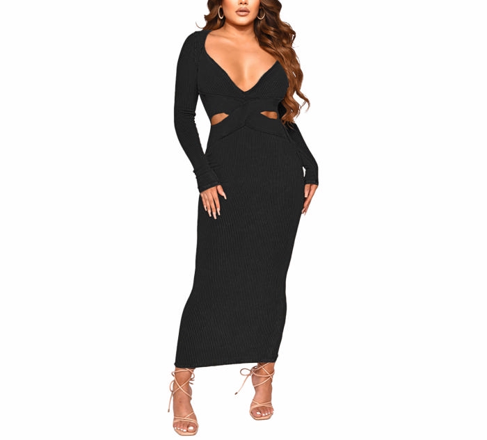 (Black)2022 Styles Women Fashion Spring&Winter TikTok&Instagram Styles Cut Out Long Sleeve Maxi DressSKU: #XF82072-2