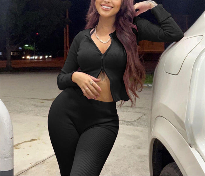 (Black)2022 Styles Women Fashion Spring&Winter TikTok&Instagram Styles Front Zipper Two Piece SuitSKU: #CF77123-2