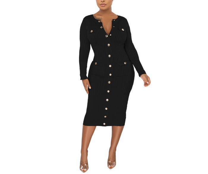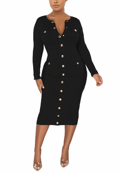 (Black)2022 Styles Women Fashion Spring&Winter TikTok&Instagram Styles Long Sleeve Front Button Midi DressSKU: #XF82067-1