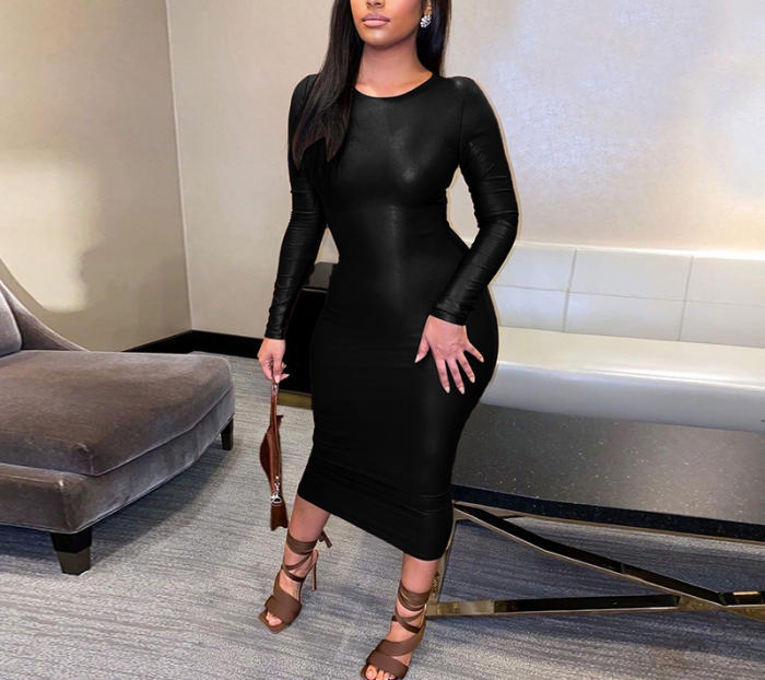 (Black)2022 Styles Women Fashion Spring&Winter TikTok&Instagram Styles PU Long Sleeve Maxi DressSKU: #CF22845-2