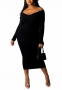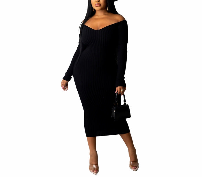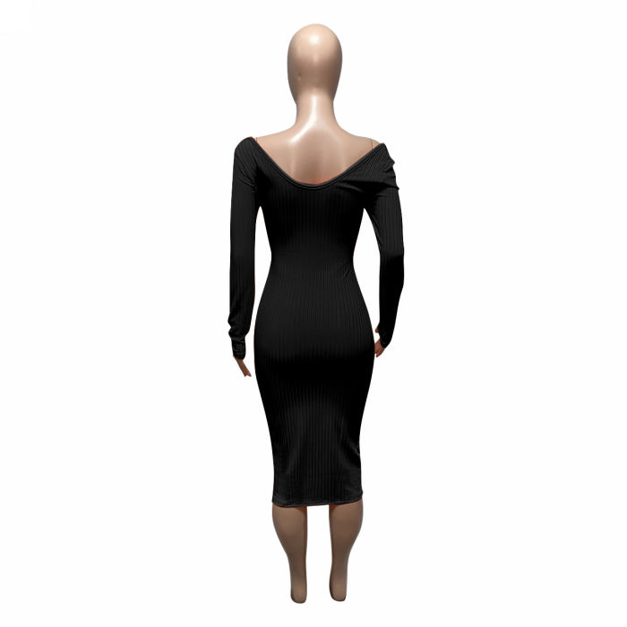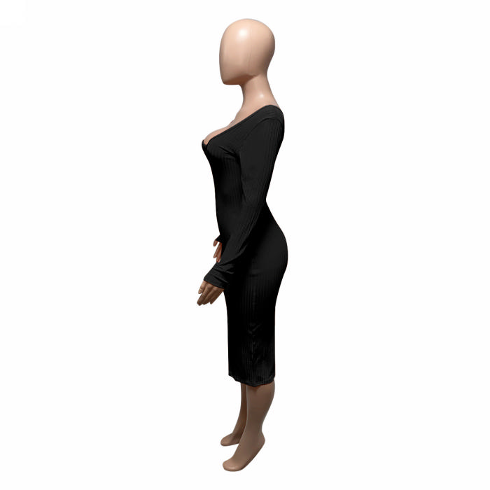 (Black)2022 Styles Women Fashion Spring&Winter TikTok&Instagram Styles Solid Color Long Sleeve Midi DressSKU: #XF82071-6