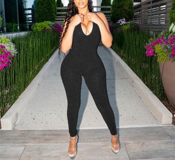 (Black)2022 Styles Women Fashion Summer TikTok&Instagram Styles Backless Velvet Halter JumpsuitSKU: #CF49920-2