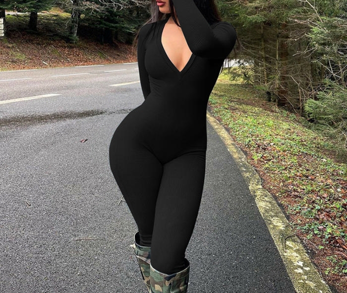 (Black)2023 Styles Women Sexy&Fashion Autumn/Winter TikTok&Instagram Styles Long Sleeve V Neck JumpsuitSKU: #CF88190-2