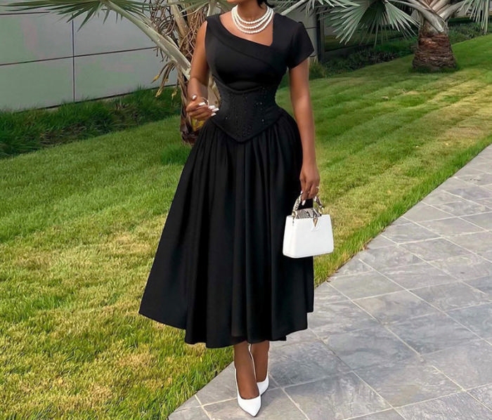 (Black)2024 Styles Plus Size Women Summer Asymmetrical Collar Waist-Cinch Slimming Short Sleeve A-Line Midi DressSKU: #CF91056-2