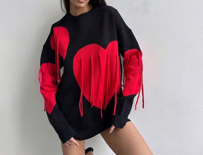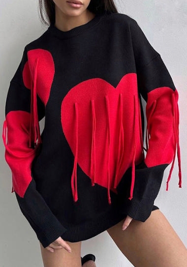 (Black)2024 Styles Women Autumn/Winter Long Sleeve Heart Tassel Loose Round Neck Pullover SweaterSKU: #CF83423-2