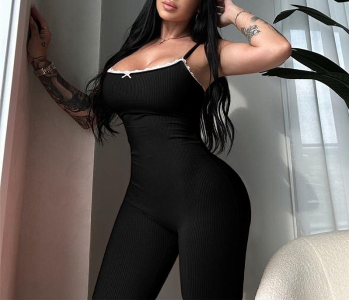 (Black)2024 Styles Women Autumn/Winter Sexy Halter Bodysuit with Bow-Tie and High-Waist Pants SetSKU: #CF77845-2