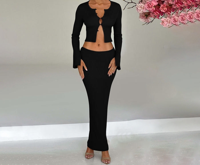(Black)2024 Styles Women Autumn/Winter Stylish Open-Front Crop Top & High-Waist Pencil Skirt SetSKU: #CF88315-3