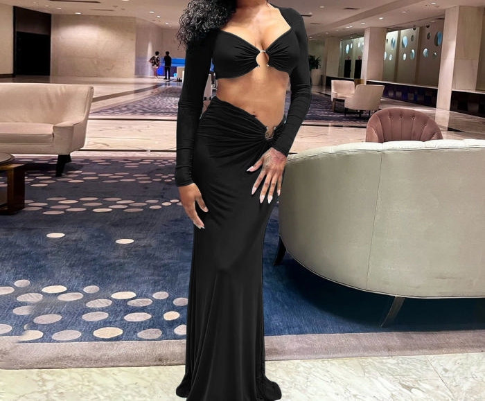 (Black)2024 Styles Women Cutout Metallic Button Long Sleeve Top with Fitted Long Skirt SetSKU: #CF88307-2
