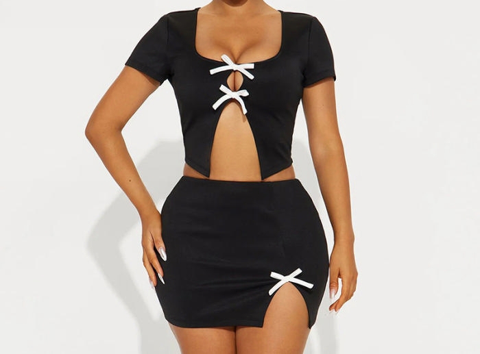 (Black)2024 Styles Women Exposed Waist Bow-Knot Lace-Up Top Women's T-Shirt and Bodycon Skirt SetSKU: #CF92155-2