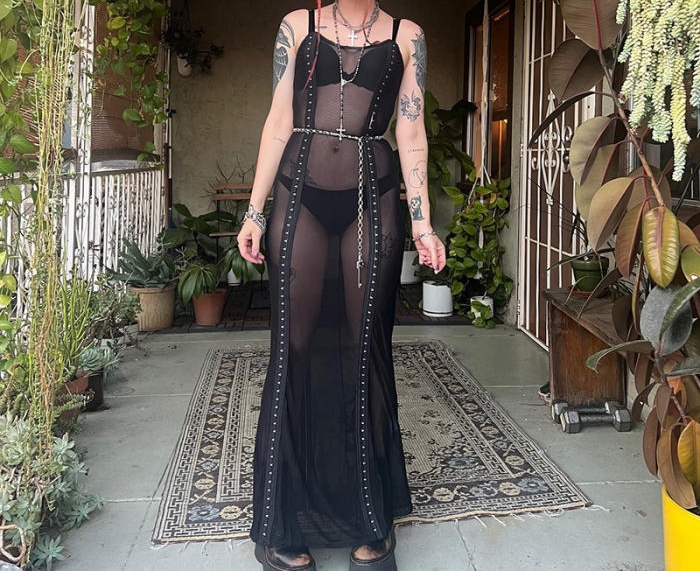 (Black)2024 Styles Women Fashion Print Mesh Sheer Metal Buckle High Split Halter DressSKU: #CF76164-2