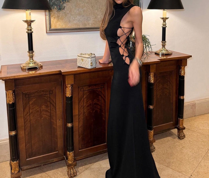 (Black)2024 Styles Women Knit High-Neck Side-Cutout Ribbon-Tied DressSKU: #XF92940-2