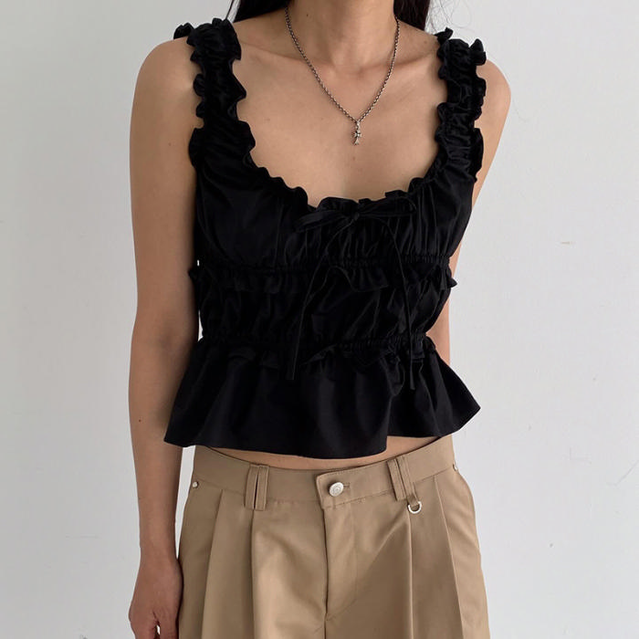(Black)2024 Styles Women Pure Desire Fresh Sweet Pleated Sleeveless U-Neck Crop TopSKU: #CF761801-2