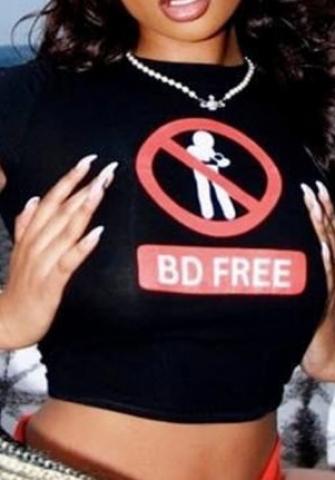 (Black)2024 Styles Women Round Neck Cropped Printed T-ShirtSKU: #CF59932-2