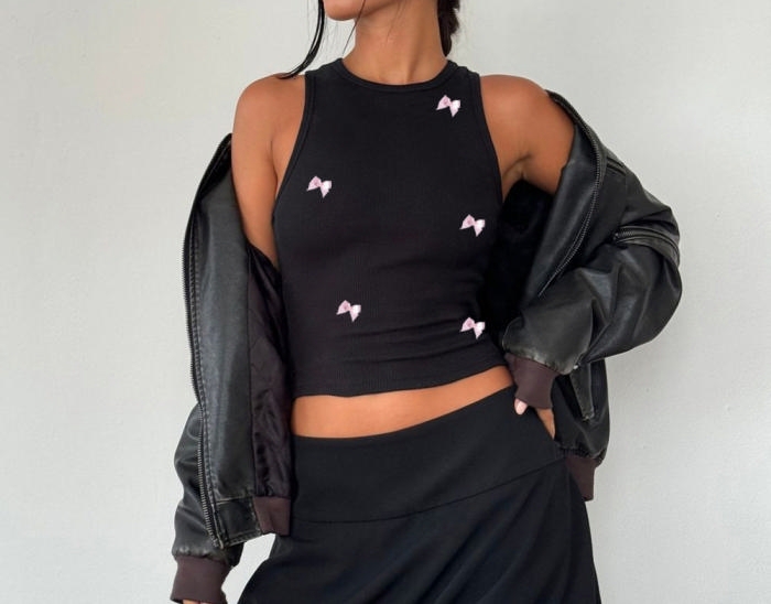(Black)2024 Styles Women Summer Cool Round Neck Crop Top with Bow Tie Fashionable TankSKU: #CF59849-2