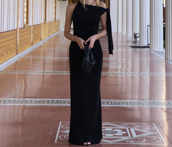 (Black)2024 Styles Women Summer Fashion Elegant One-Shoulder Draped Sash Solid Color Maxi DressSKU: #CF88233-2