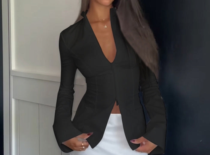 (Black,Only Tops)2024 Styles Women Solid-Color Versatile Long-Sleeve Zippered Shirt TopSKU: #XF92902-2
