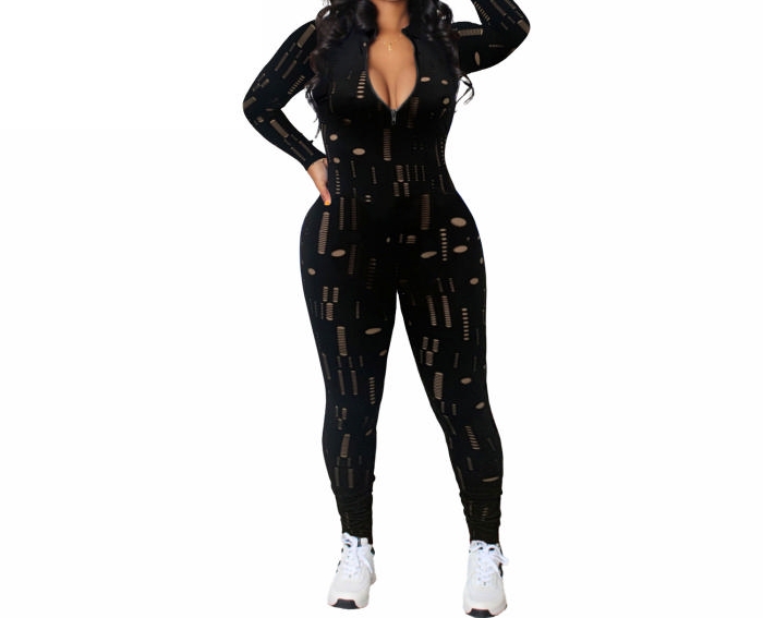 (Black)(Plus Size)2023 Styles Women Sexy&Fashion Spring&Summer TikTok&Instagram Styles Hollow Long Sleeve JumpsuitSKU: #XF27334-1