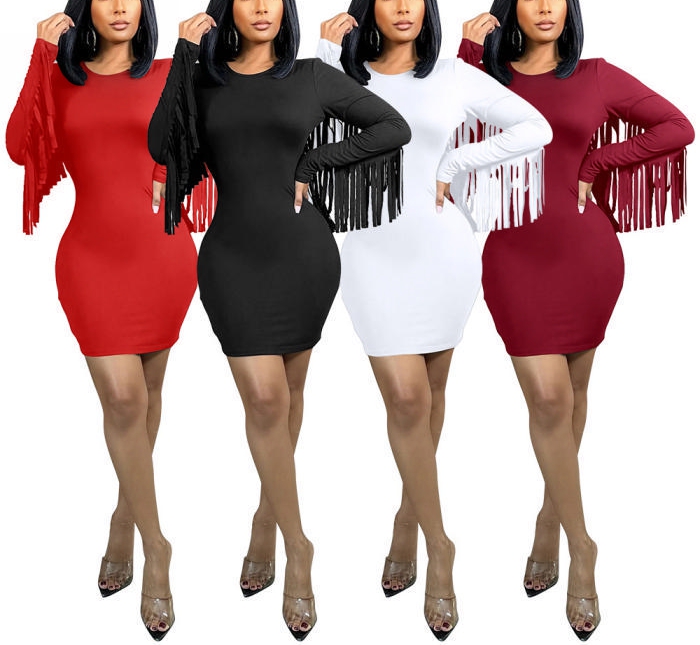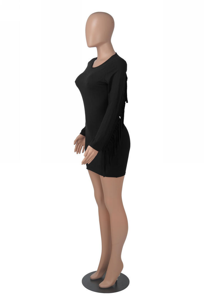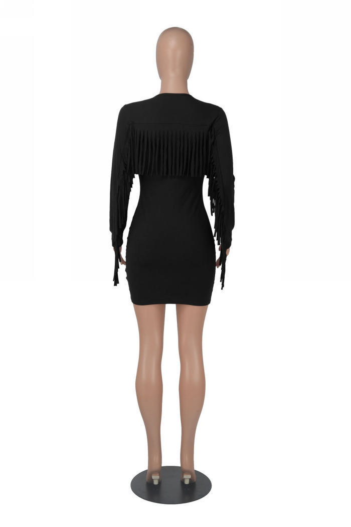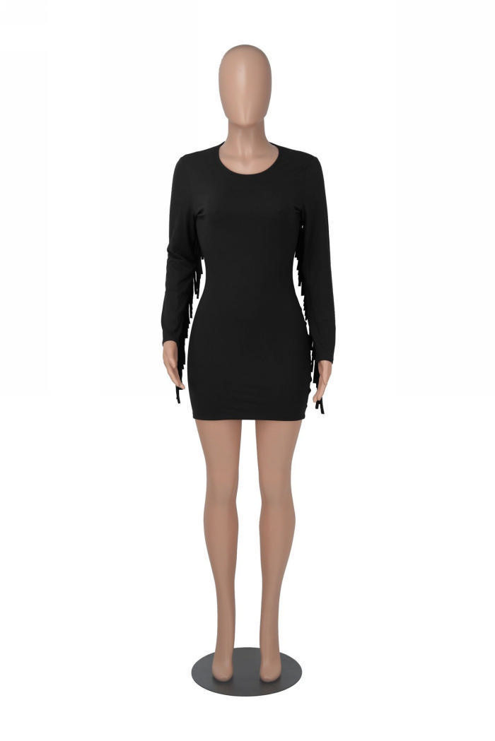 (Black)(Real Image)2022 Styles Women Fashion Spring INS Styles Solid Color Tassel Long Sleeve Mini DressSKU: #OEM5243-4