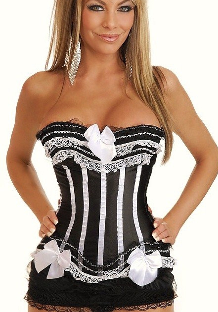 Black White Bows Vertical Stripes Flower Satin OverBust CORSETSKU: #QX10557-0