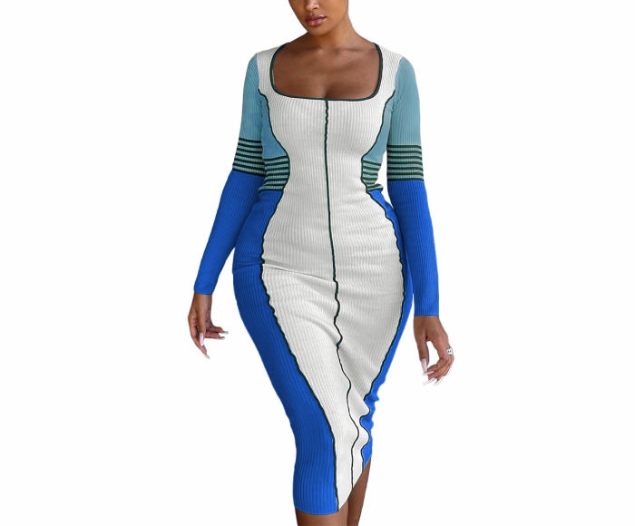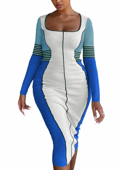 (Blue)2022 Styles Women Fashion Spring&Winter TikTok&Instagram Styles Contrast Color Long Sleeve Midi DressSKU: #XF82070-3
