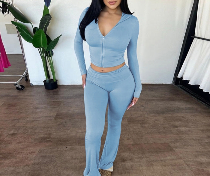 (Blue)2024 Styles Women Autumn/Winter Sexy Cropped Long Sleeve Hooded Top & Fitted Flare Pants SetSKU: #CF77846-3