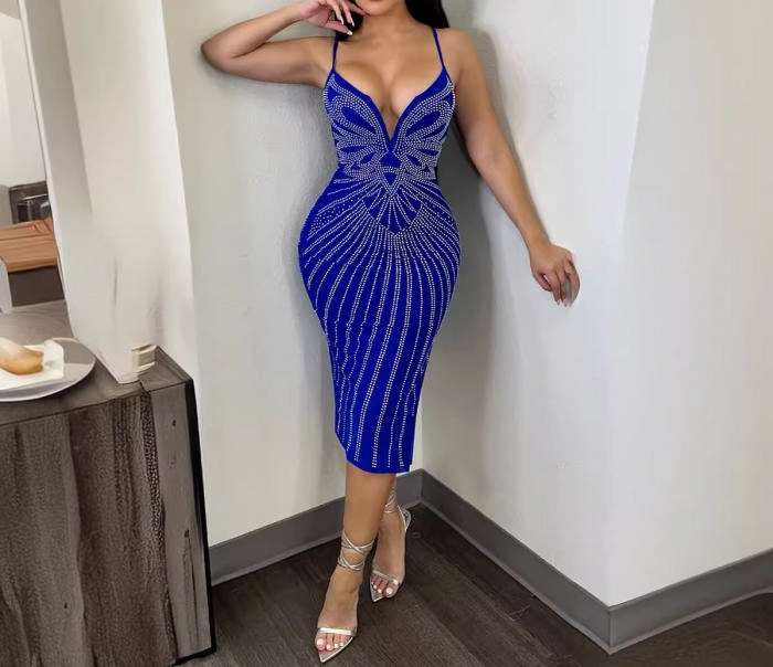 (Blue)2024 Styles Women Glamorous Sequined V-Neck Bodycon Halter DressSKU: #XF27506-2