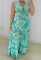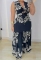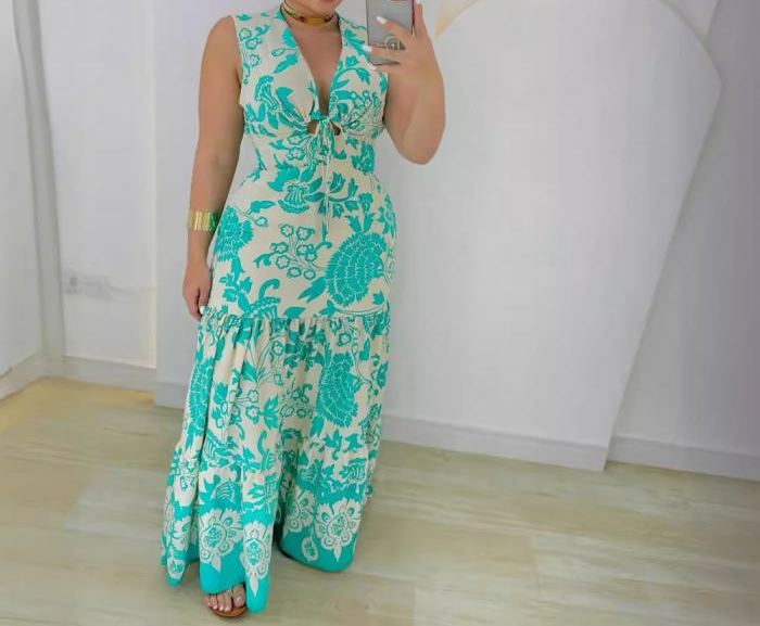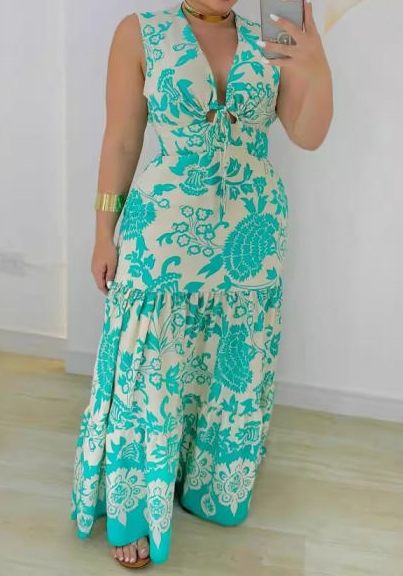 (Blue)2024 Styles Women Printed Patchwork Lace-up Waist Sheer Sleeveless Gathered DressSKU: #XF27480-2