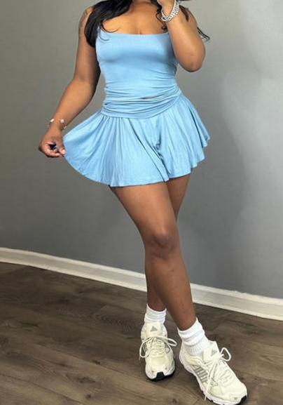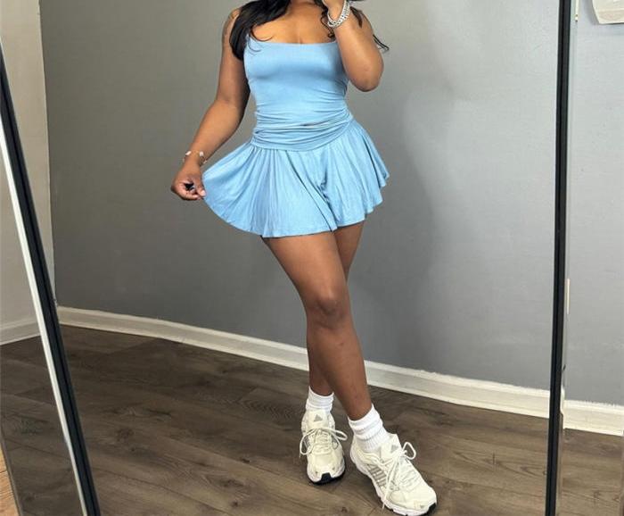 (Blue)2024 Styles Women Stylish Trendy Strapless Sleeveless Slim Fit Pleated Mini Skirt SetSKU: #CF83364-2