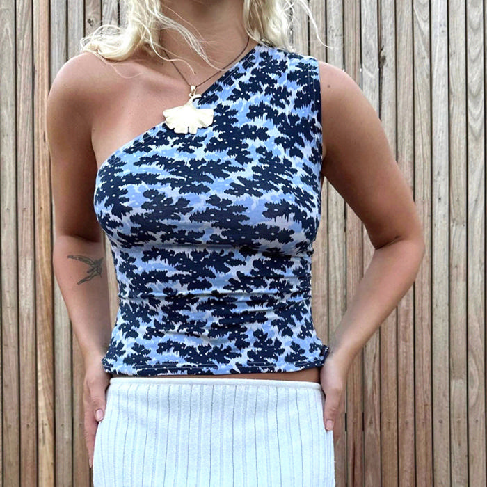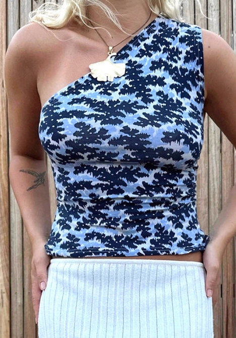 (Blue&Black,Only Tops)2024 Styles Women Asymmetrical Shoulder Multicolor Print Casual Versatile T-Shirt TopSKU: #CF92080-5