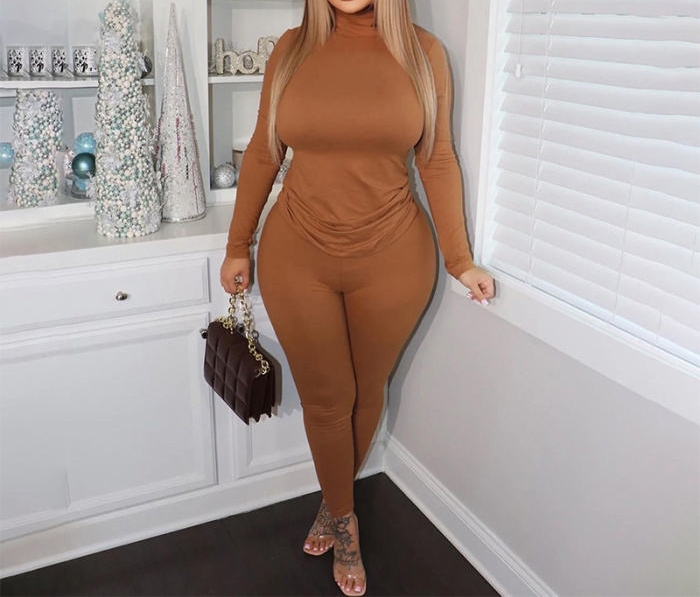 (Brown)2023 Styles Women Sexy&Fashion Autumn/Winter TikTok&Instagram Styles Solid Color Two Piece SuitSKU: #CF47804-5