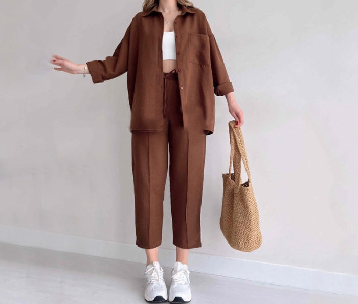 (Brown)2024 Styles Plus Size Women Spring Casual Loose Shirt Jacket and Cropped Sporty Harem Pants Two-Piece SetSKU: #CF91031-5