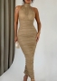 (Coffee)2024 Styles Women Spring Slim Fashion Shiny Halter Pleated Dress Bodycon Maxi DressSKU: #XF92866-2