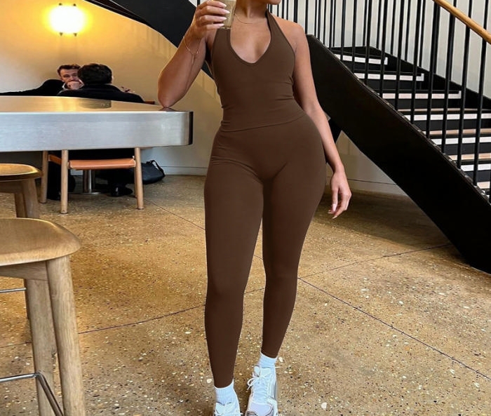 (Coffee)2024 Styles Women Summer Fashion Street Snap Backless Tank Top and Slim Yoga Pants SetSKU: #CF88251-3