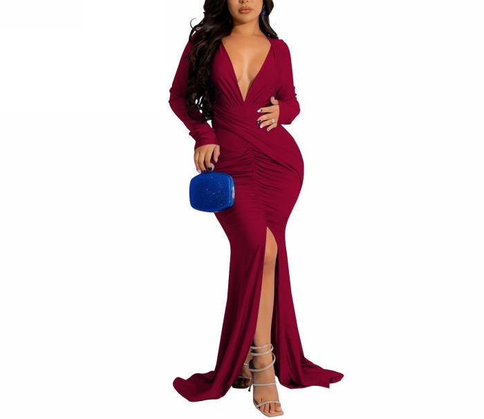 (Dark Red)2022 Styles Women Sexy Spring&Winter TikTok&Instagram Styles Cross V Neck Long Sleeve Maxi DressSKU: #CF79020-4