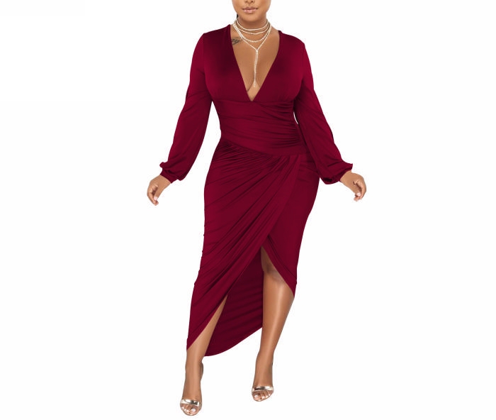 (Dark Red)2022 Styles Women Sexy Spring&Winter TikTok&Instagram Styles V Neck Long Sleeve Irregular Maxi DressSKU: #CF79021-4